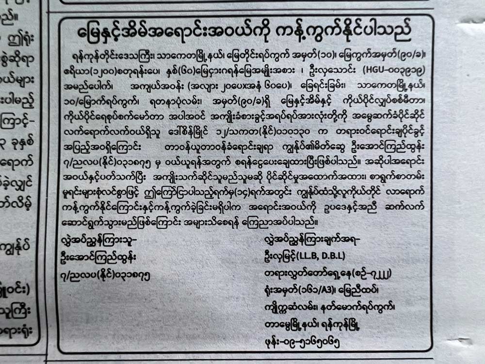 ရန်ကုန်တိုင်းဒေသကြီး၊ သာကေတမြို့နယ်၊ မြေတိုင်းရပ်ကွက်အမှတ်(၁၀)၊ မြေကွက်အမှတ်(၉၀/ခ)၊ ဧရိယာ (၁၂၀၀) စတုရန်းပေ၊ နှစ်(၆၀)မြေငှားဂရမ်မြေအမျိုးအစား၊ အကျယ်အဝန်း (အလျား ၂၀ ပေ× အနံ ၆၀ ပေ)၊ ခြေရင်းခြမ်း၊ သာကေတ မြို့နယ်၊ ၁၀/မြောက်ရပ်ကွက်၊ ရတနာပုံလမ်း၊