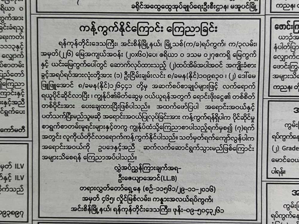 ရန်ကုန်တိုင်းဒေသကြီး၊ အင်းစိန်မြို့နယ်၊ မြို့သစ်(က/ခ)ရပ်ကွက်၊ က/၃လမ်း၊ အမှတ်(၂၂၆)၊ မြေအကျယ်အဝန်း(၂၀×၆၀)ပေ၊ ဧရိယာ ၀ ဒဿမ ၀၂၇ဧကရှိ မြေကွက်