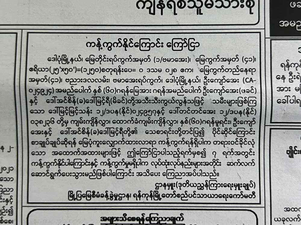 ဒေါပုံမြို့နယ်၊ မြေတိုင်းရပ်ကွက်အမှတ် (၁/ဗမာအေး)၊ မြေကွက်အမှတ် (၄၁)၊ ဧရိယာ(၂၅'x၅၀')=(၁၂၅၀)စတုရန်းပေ= ၀ ဒသမ ၀၂၈ ဧက၊ မြေကွက်တည်နေရာ အမှတ် (၄၁)၊ ဗညားဒလလမ်း၊ ဗမာအေးရပ်ကွက်၊ ဒေါပုံ
