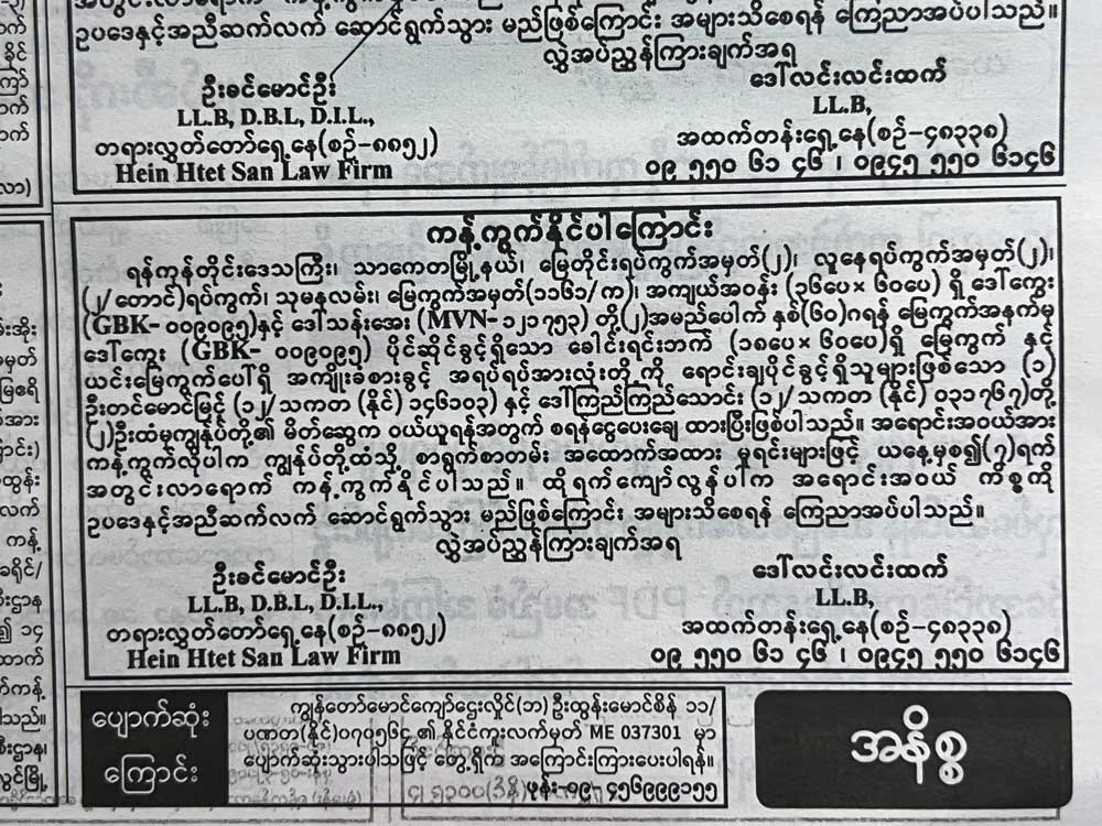 ရန်ကုန်တိုင်း ဒေသကြီး၊ သာကေတမြို့နယ်၊ မြေတိုင်းရပ်ကွက်အမှတ် (၂)၊ လူနေရပ်ကွက် အမှတ်(၂) (၂/တောင်) ရပ်ကွက်၊ သုမနလမ်း၊ မြေကွက်အမှတ် (၁၁၆၁/က) ခေါင်းရင်းဘက်