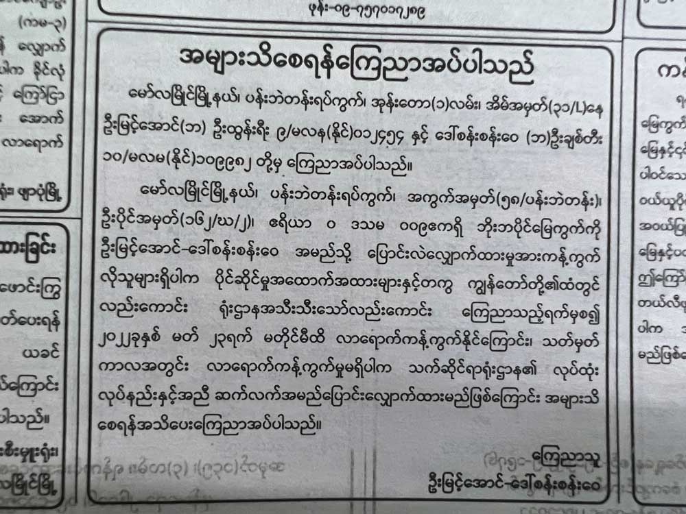 မော်လမြိုင်မြို့နယ်၊ ပန်းဘဲတန်းရပ်ကွက်၊ အကွက်အမှတ်(၅၈/ပန်းဘဲတန်း)၊ ဦးပိုင်အမှတ်(၁၆၂/ဃ/၂)၊ ဧရိယာ ၀ ဒသမ ၀၀၉ဧကရှိ ဘိုးဘွားပိုင်မြေကွက်