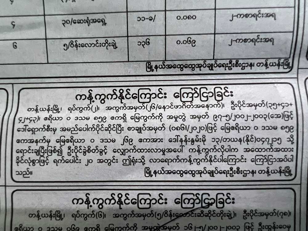 တန့်ယန်းမြို့၊ ရပ်ကွက်(၂)၊ အကွက်အမှတ်(၂၆/နောင်ဖာဂိတ်အနောက်)၊ ဦးပိုင်အမှတ်(၃၅+၄၁+၄၂+၄၃)၊ ဧရိယာ ၀ ဒသမ ၈၅၉ ဧကရှိ မြေကွက်