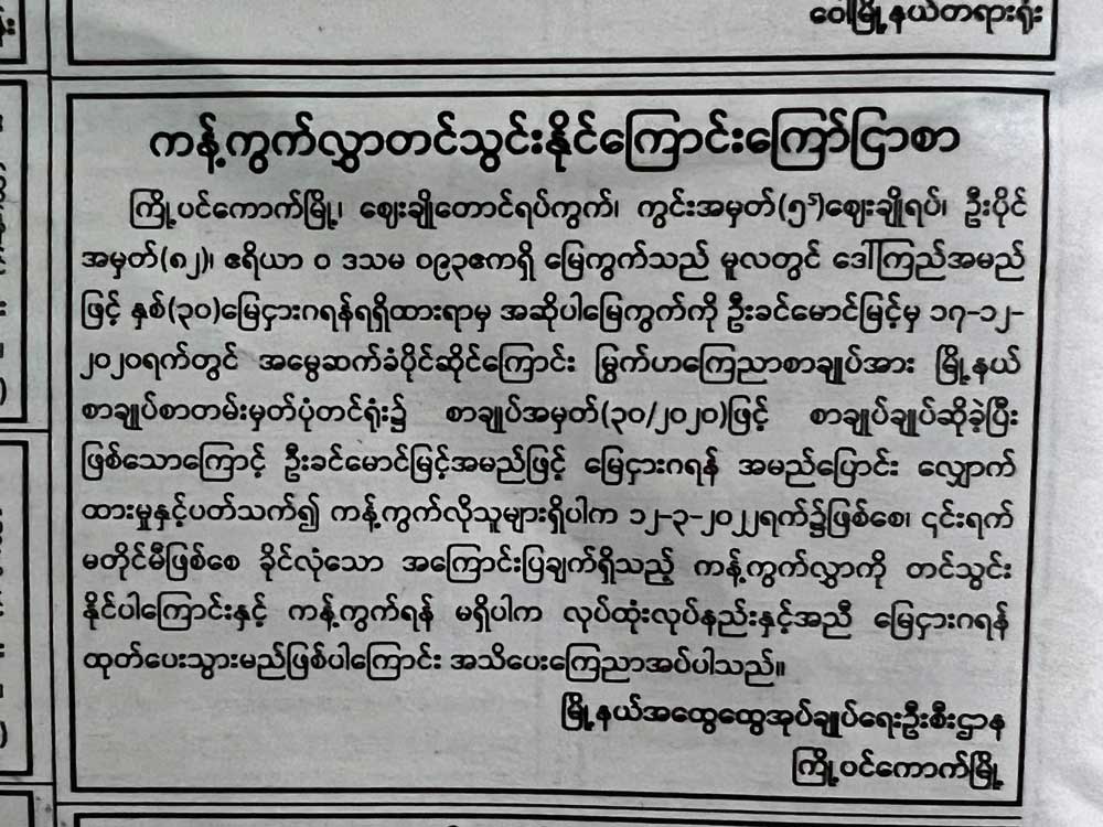 ပဲခူးတိုင်းဒေသကြီး ကြို့ပင်ကောက်မြို့၊ စျေးချိုတောင်ရပ်ကွက်၊ ကွင်းအမှတ်(၅)စျေးချိုရပ်၊ ဦးပိုင်အမှတ်(၈၂)